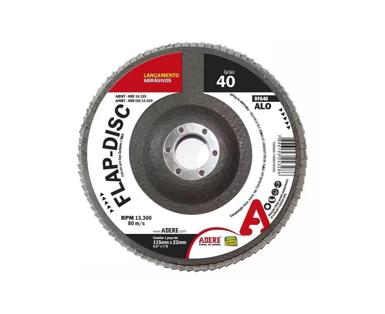 O Flap-Disc Alo ADERE é um disco para lixamento de Aço Carbono, Aço Inox e outros metais ferrosos e não ferrosos, composto por flaps (pedaços) de lixas com grão Óxido de Alumínio, fixados com adesivo em um suporte de fibra de vidro. Aplicação : Desbaste e acabamento de soldas, rebarbas, remoção de pinturas antigas e eliminação de ferrugem, aliando ... ler mais