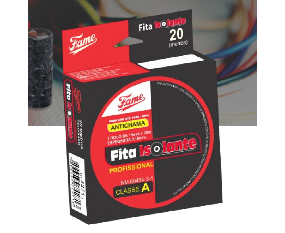 FITA ISOLANTE FAME UP 19MMX20MX0,18MM   A Fita Isolante FAME é feita em filme de PVC antichama, com adesivo a base de borracha sensível à pressão, indicada para instalações elétricas de baixa tensão.   - Para uso até 750V, à temperatura de 90°C.   - Antichama.   - Com proteção contra raios UV.