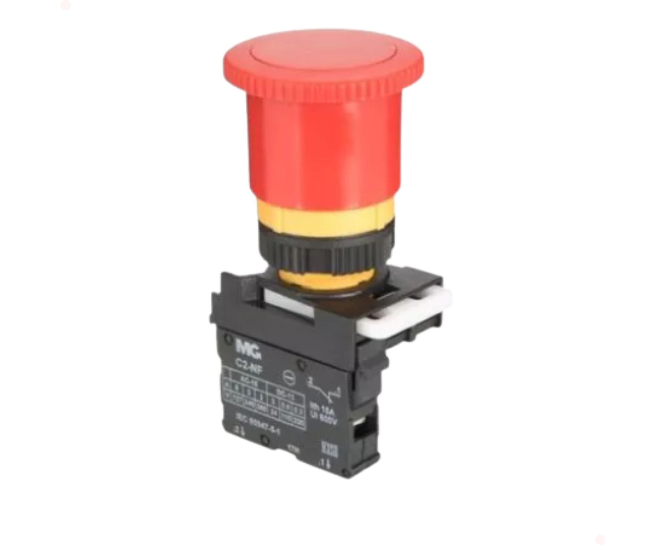 O botão cogumelo de emergência ou botão de emergência, é usado para desligar o comando em caso de alguma anormalidade. O botão de emergência conta com retenção, desligando quando pressionado. Para retornar ao seu estado normal, é necessário girar ou puxar o botão, de acordo com o modelo. Código 17445 -  Atuador: Vermelho  Modelo: Longo - Puxar para soltar 1NF