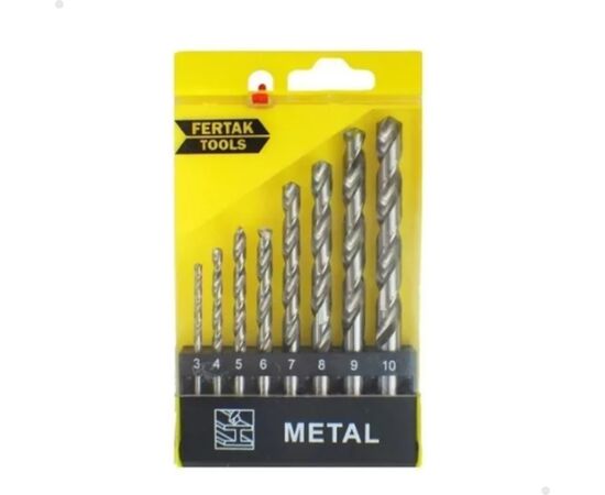 Jogo De Brocas Metal 8 Peças Fertak 1205 O jogo de Brocas HSS para Metal Fertak vem com 8 brocas HSS em milímetros, de diversos tamanhos, em um prático estojo para acondicionamento das brocas. Ela foi desenvolvida com aço com afiação própria para perfuração de ferro e outros metais. O Kit Contém:  - 8 Brocas, nos tamanhos 3, 4, 5, 6, 7, 8, 9 e 10 mm - Estojo para acondicionar as brocas