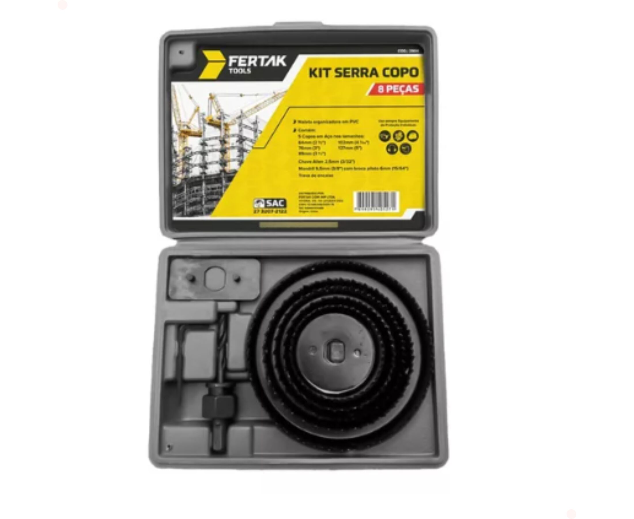 Conteúdo: 5 serras copo (64 mm, 76 mm, 89 mm, 102 mm, 127 mm) 1 mandril 9,5 mm com broca piloto 6 mm 1 chave Allen 2,5 mm 1 trava de encaixe Maleta organizadora Aplicação: Corte em madeira, plásticos, gesso e metais leves. Tamanho da maleta: Compacta e prática para transporte. Material: Aço carbono, alta durabilidade.