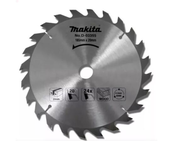 Lâmina De Serra Tct D-03355 Makita CARACTERÍSTICAS: Aplicação em madeira. Ideal para serra circular portátil. ESPECIFICAÇÕES: Diâmetro: 185mm Furo: 20mm Espessura de corte: 2 Espessura do disco: 1,3 Número de dentes: 24 Ângulo do dente: 20