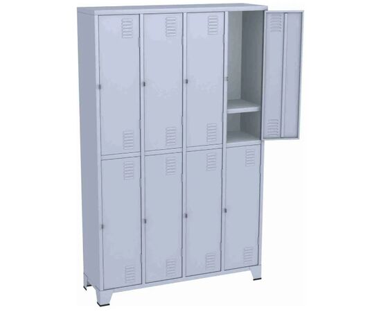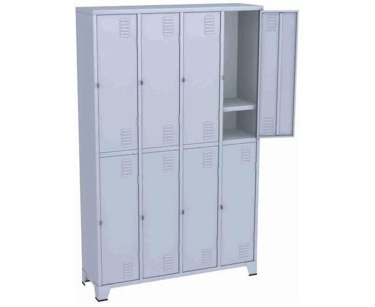 Armário Roupeiro para vestiário, produzido em aço chapa 26 0,45mm, possui 8 portas com venezianas para ventilação, compartimento de tamanho grande independentes com divisória interna na horizontal , fechamento das portas através de pitão para cadeado.